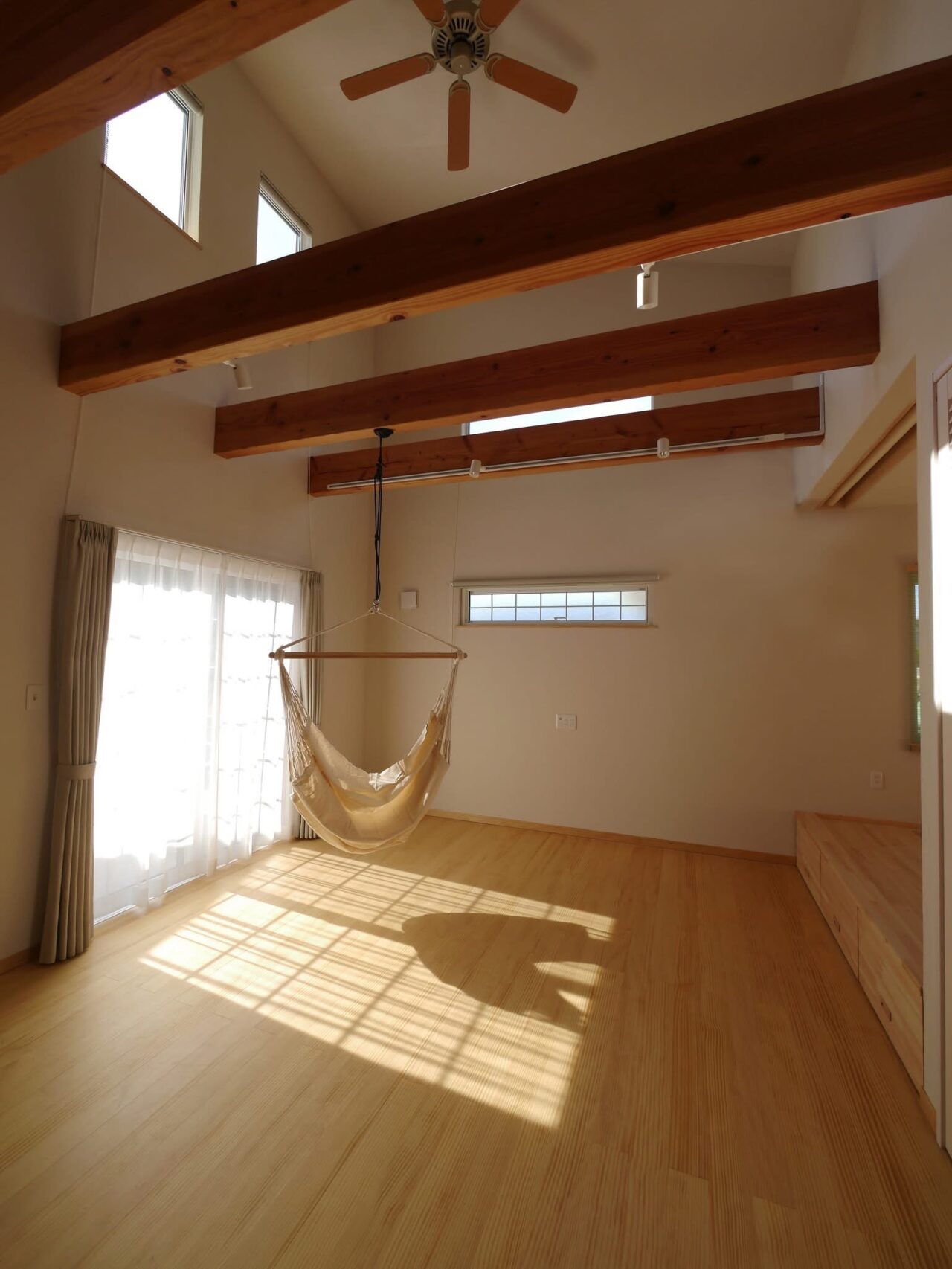 家族の時間を包むリビングでは、吹抜け天井と高窓から光が差し込み